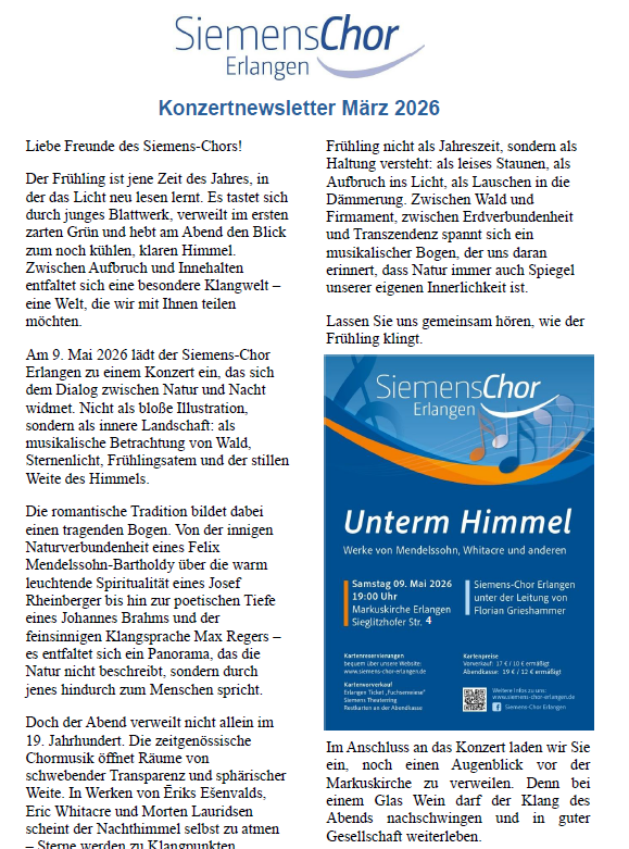 Kartenvorbestellung unter: ticket@siemens-chor-erlangen.de